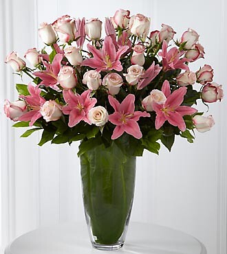Grant them the ultimate indulgence with a blushing bouquet of beauteous and bountiful blooms. Our finest pale pink 24-inch premium long-stemmed roses are graceful and gorgeously elegant offset by the brilliance of pink Asiatic Lilies, all lovingly situated in a unique and superior 14-inch clear glass tapered bullet vase to delight and dazzle.
